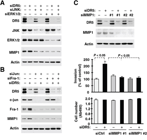 Since the expression of MMP1 is known to be regulated by JNK/AP1 and ERK signaling [23], we next asked whether activation of JNK/AP-1 or ERK mediates MMP1 upregulation induced by DR5 knockdown in our cell systems. Inhibition of JNK, ERK or both by knocking down their expression singly and in combination not only decreased basal levels of MMP1, but also blocked DR5 knockdown-induced MMP1 elevation (Fig. 5A). Consistently, inhibition of AP1 by knockdown of c-Jun, Fra-1 or both reduced basal levels of MMP1 and abolished DR5 knockdown-induced MMP1 upregulation (Fig. 5B). Hence, these data lead convincingly to the conclusion that the activation of JNK/AP-1 and ERK signaling mediates MMP1 upregulation induced by DR5 knockdown. Following these studies, we further determined whether MMP1 is indeed critical for mediating cell invasion induced by DR5 knockdown. As shown in Fig. 5C, DR5 knockdown promoted cell invasion in control siRNA-transfected cells, but not in cells transfected with MMP1 siRNAs, indicating that MMP1 elevation or activation is indeed critical for DR5 knockdown-induced promotion of cell invasion.