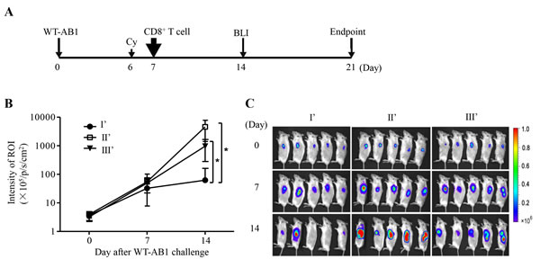 Figure 4: Adoptive transfer of tumor-specific CD8+ T cells eliminates established WT-AB1 malignant mesothelioma. A. Time schedule of the adoptive transfer of CD8+ T cells. SCID mice were pre-inoculated s.c. with 5x105 WT-AB1 cells, and tumors were left to grow for 7 days to reach approximately 5 mm in length. Cyclophosphamide (Cy) was injected intraperitoneally (150 mg/kg) one day before the adoptive transfer of CD8+ T cells. 2x106 of isolated CD8+ T cells in 100 μl PBS were then injected via the tail vein into each mouse. B. Tumor growth was assessed by BLI overtime. CD8+ T cells of groups I, II and III were adoptively transferred i.v. into SCID mice of groups I’, II’ and III’, correspondingly. Intravenous transfer of CD8+ T cells of group I significantly eliminated established WT-AB1 tumor in SCID mice of group I’ (n = 5). Data represent mean ± s.e.m. *P = 0.0194. C. Representative BLI of WT-AB1 tumor growth in three groups of SCID mice. Images were acquired at the indicated time points after WT-AB1 tumor inoculation.