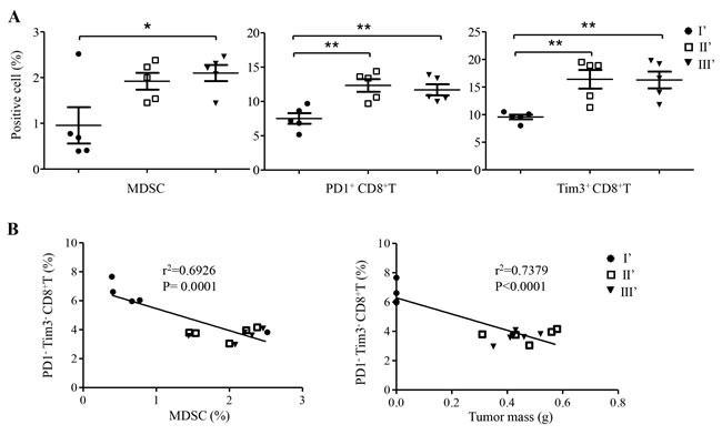 Figure 5: Frequency and correlation analysis of CD8+ T cells and MDSC in spleens of SCID mice of groups I’, II’ and III’. A. Frequencies of MDSC, PD1+ CD8+ T cells, and Tim3+ CD8+ T cells were measured at the experimental endpoint (Figure 4A). Data represent mean ± s.e.m. *P < 0.05; ** P < 0.01; ***P < 0.001. B. The frequency of PD1-Tim3- CD8+ T cells was inversely correlated with that of MDSC (left panel) and with tumor mass (right panel), respectively.