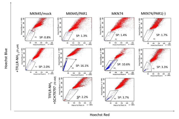 Figure 1: Representative FACS analysis of side population cells in human gastric cancer cell lines. The upper row; these panels are FACS analysis of side population MKN45/mock, MKN45/PAR1, MKN74, and PAR1 siRNA transfected MKN74 (MKN74/PAR1(-)) cells which were not stimulated. The middle row; these panels are FACS analysis of side population MKN45/mock, MKN45/PAR1, MKN74, and MKN74/PAR1(-) cells which were treated with the PAR1 agonist TFLLR-NH2. The side population fractions in MKN45/PAR1 and MKN74 cells treated with TFLLR-NH2 were increased 16.1% and 10.6%, respectively. The lower row; these panels are FACS analysis of side population MKN45/PAR1 and MKN74 cells which were treated with TFLLR-NH2 and PAR1 selective antagonist SCH79797.