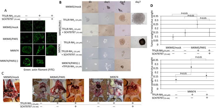 Figure 2: PAR1 activation induces tumor initiating potential in gastric cancer cells. A. Immunofluorescence staining with anti-actin (green) in gastric cancer cells. MKN45/PAR1 and MKN74 cells which were treated with TFLLR-NH2 presented morphological change. B. Spheroid colony formation assay. MKN45/mock, MKN45/PAR1, MKN74, and MKN74/PAR1(-) cells were cultured in ultra-low attachment microplates under the various conditions, and both MKN45/PAR1 and MKN74 cells treated with TFLLR-NH2 were cultured for 7 days and other conditions cells were cultured for 4 days. All scale bars is 100 µm. C. Evaluation of tumor proliferation in nude mice revealed extensive peritoneal dissemination in MKN45/PAR1 and MKN74 cells treated with TFLLR-NH2. D. Effect of PAR1 activation on primary tumor growth and spread. Before inoculation of MKN45/PAR1 and MKN74 cells, these cells treated with TFLLR-NH2 and/or SCH79797. The groups were compared to each other with respect to tumor burden (given as the ratio of tumor weight over total situs weight). The median value is indicated by a bold bar.