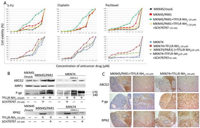 Figure 3: PAR1 activation acquires anti-cancer drug resistance. A. Cell viabilities in response to chemotherapeutic induction, and the degrees of cytotoxicity of Cisplatin, 5-FU and Paclitaxel on the cells were measured. Under various conditions, MKN45/mock, MKN45/PAR1 and MKN74 cells were seeded in 96-well plates and treated with Cisplatin, 5-FU, and Paclitaxel for 24 h prior to the determination of cell viability. Data are the mean ± SD of five independent experiments. B. Western blot assays showing ABC-transporter, ABCG2, MRP1 and P-gp expression, and RPN2, which regulated glycosylation status of P-gp, by western blot assays. C. We show peritoneal dissemination in nude mice indicated by means of immunhistochemical staining of ABCG2, P-gp, and RPN2.