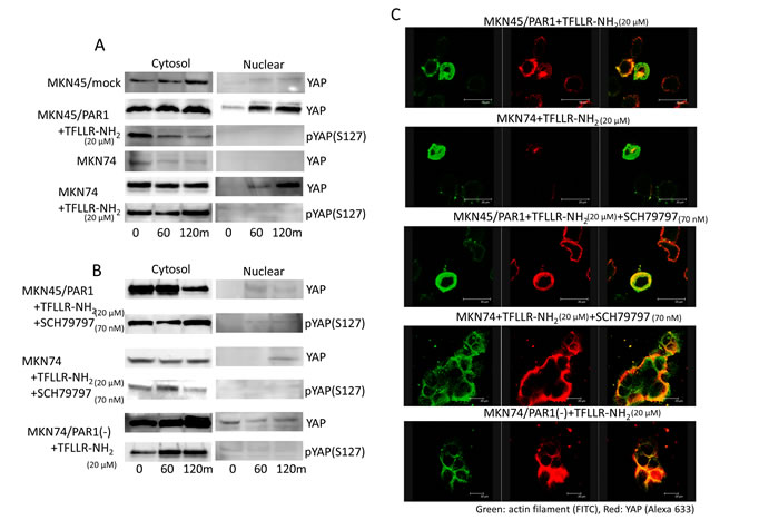 Figure 4: PAR1 promotes YAP dephosphorylation. The left line panels are immunoblotting of cytoplasmic lysates. The right panels are immunoblotting of nucleus lysates. A. Both MKN45/PAR1 and MKN74 cells were treated with TFLLR-NH2 for indicated periods of time. Cytoplasmic and nuclear cell lysates were separated. And these cells lysates were subjected to immunoblotting with the YAP1 and pYAP1 (S127). B. Both MKN45/PAR1 and MKN74 cells were treated with TFLLR-NH2 and SCH79797 for indicated times. MKN74/PAR1(-) cells were treated with TFLLR-NH2 for indicated times. These cell lysates were also separated cytoplasmic and nucleus and subjected to immunoblotting with the YAP1 and pYAP1 (S127). C. Immunofluorescence staining with anti-actin (green) and anti-YAP1 (red) antibodies; the right panels show the overlay of the green and red staining.