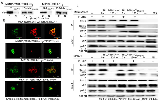 We reported that activated PAR1 induced Rho GTPase activation, and Rho GTPase has been reported to induce YAP dephophorylation [24, 25]. We analysed the function of Rho in TFLLR-NH2-induced YAP dephosphorylation. To determine the function of Rho in YAP regulation, we tested the effect of botulinum toxin C3 (for 5 h), a specific inhibitor of Rho GTPase, and Y27632 (for 4 h), Rho-associated kinase (ROCK) inhibitor, on YAP phosphorylation. Western blot assays indicate that C3 treatment strongly suppressed YAP dephosphorylation in both MKN45/PAR1 and MKN74 cells treated with TFLLR-NH2 (Figure 5A). Immunofluorescence assays of both MKN45/PAR1 and MKN74 cells treated with TFLLR-NH2 and C3 indicate that YAP did not moved into the nucleus (Figure 5B). In contrast, Inhibition of ROCK by Y27632 treatment had a marginal effect on TFLLR-NH2 induced YAP dephosphorylation and nuclear localization (Figure 5A and 5B).