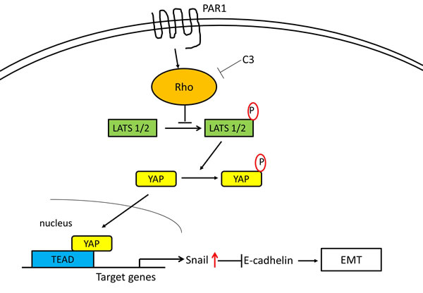 We reported that PAR1 activation by thrombin induced epithelial-mesenchymal transition (EMT) via Snail [22]. And YAP and TAZ have also been shown to induce EMT in human breast epithelial cells in a Tead-dependent manner [37]. Lats2 acts as a positive modulator of Snail1 protein level and potentiates its in vivo EMT activity [38]. And YAP potentiates Smad signaling to increase expression of the downstream target genes Snail, Slug, and Twist1, which are important transcriptional regulators of EMT [39]. At this time, we have shown that the Hippo-YAP pathway undergoing PAR1 activation is deeply involved with in the induction of EMT. When PAR1 signaling via Rho was inhibited or YAP underwent knockdown, EMT markers E-cadherin and fibronectin expression levels were not changed significantly and cell motility were markedly reduced. Migration is an important initial step in EMT and this decrease in cell motility further underlines the importance of PAR1. When Snail underwent knockdown, we confirmed that YAP was dephosphorylated and localized in nucleus under the influence of TFLLR-NH2. These data implicates that the Hippo-YAP signaling pathway caused by activated PAR1 significantly increased with the intranuclear mobility of Snail which was promoted by PAR1 activation, and so this signaling pathway induced EMT in oncogenesis. The pathways established are summarized in the scheme shown in Figure 7.