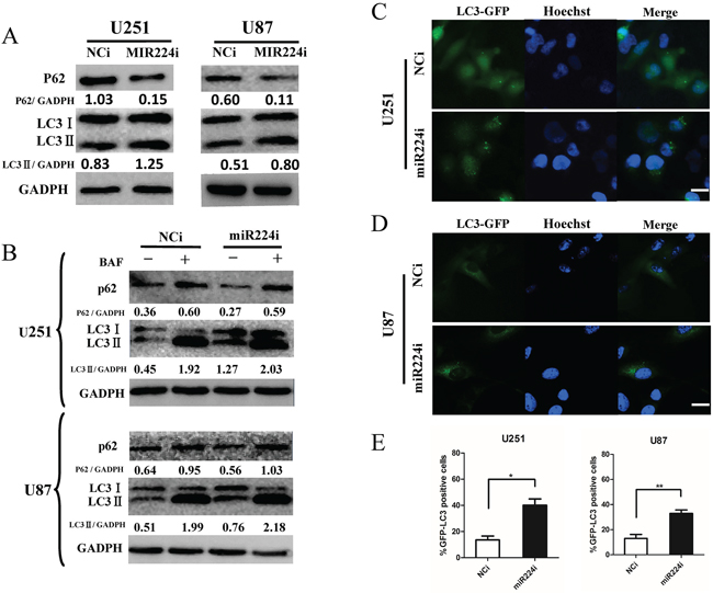 Figure 3: miR224-3p influences glioblastoma cell autophagic activity. A. U251 and U87 cells were transfected with miR224i (100 nM) for 24 h. LC3B, p62 and GAPDH levels were determined by Western blot. B. U251 and U87 cells were transfected with miR224i (100 nM) or NCi and BAF (20 nM) were applied to the medium for 24 h at 24 h post transfection. LC3B, p62 and GAPDH levels were determined by Western blot. C. and D. U251 and U87 cells stably expressing GFP-LC3 were transfected with miR224i or NCi for 24 h and then fixed. Representative images are shown. Scale bar, 20 μm. E. Percentages of GFP-LC3 puncta-positive cells in (C) and (D) are shown. The data shown are the mean ± SD of independent experiments, n = 3. MiR224i, miR224-3p inhibitor; NCi, miRNA inhibitor negative control. *P < 0.1, **P < 0.01, Student’s 2-tailed t test.
