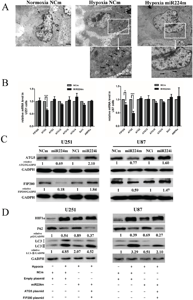 Figure 5: miR224-3p regulates autophagy by targeting multiple ATGs. A. U251 cells transfected with miR224m or NCm were exposed to hypoxia for 24 h. Characteristic autophagosomes (arrows) were shown in representative images from transmission electron microscopy. Scale bar, 1.2 μm. B. U251 and U87 cells were transfected with miR224m or NCm and incubated for 48 h. mRNA expression levels of predicted targets of miR224-3p were determined by q-PCR. The data shown are the mean ± SD of independent experiments, n = 3. C. U251 and U87 cells were transfected with miR224m, NCm or miR224i, NCi and incubated for 48 h. The cells were then harvested for Western blot. D. U251 and U87 cells were transfected with miR224m and co-transfected with both ATG5 and FIP200 plasmids at the same time for 24 h and then exposed to the hypoxia. After 24 h, cells were harvested for Western blot. Quantitative relative analyses of the western blot were calculated following Quantity One analysis. MiR224m, miR224-3p mimic; miR224i, miR224-3p inhibitor; NCm, miRNA mimic negative control; NCi, miRNA inhibitor negative control. *P < 0.05, ***P < 0.001, Student’s 2-tailed t test.