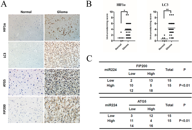 Figure 7: miR224-3p inversely correlates with ATG5 and FIP200 expression in human glioma tissues. A. Representative images of glioma and normal brain tissue showed the immunostaining of HIF1α, LC3B, ATG5 and FIP200 (magnification, 400×). B. The total immunostaining scores of HIF1α and LC3B were estimated. The significant differences in expression between glioma and normal brain were analyzed by Student’s 2-tailed t test. C. Associations between ATG5 and miR224-3p, FIP200 and miR224-3p expression in 30 glioma tissue specimens were analyzed by Fisher’s exact test. Patients were classified as high or low miR224-3p expression groups based on the miR224-3p-expression in tumors above or below the median values respectively. *P < 0.05, **P < 0.01.