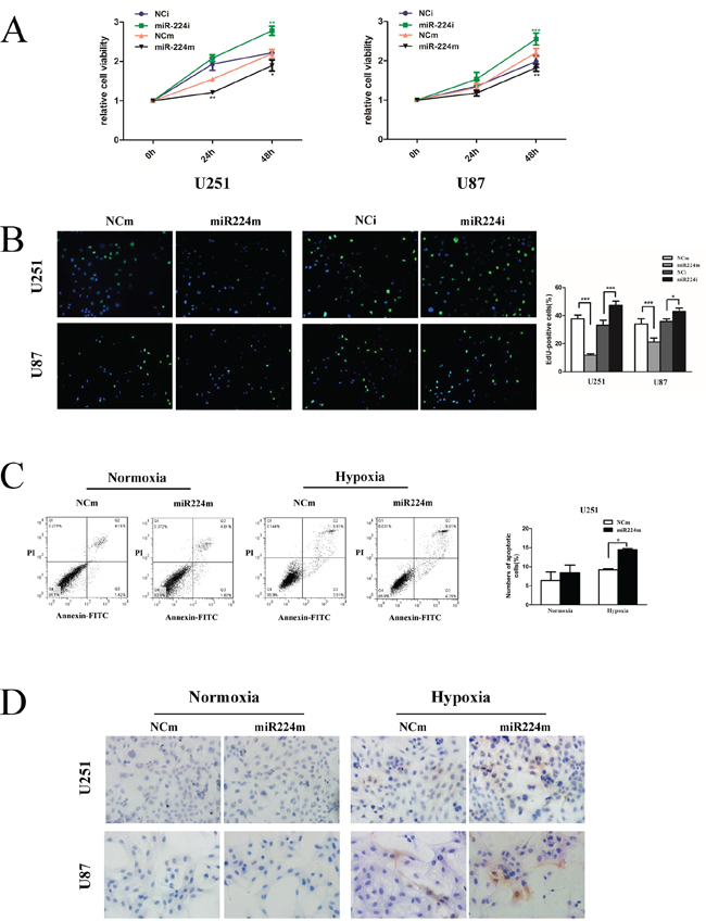 Figure 8: miR224-3p suppresses glioblastoma cell proliferation and promotes hypoxia-induced apoptosis. A. U251 and U87 cells were transfected with 100 nM miR224m, NCm or miR224i, NCi for 24 h, and CCK8 assays were then performed at each time point (0 h, 24 h, 48 h). B. Proliferation of transfected U251 and U87 cells as in (A) was examined by EdU assay. C. miR224-3p overexpression was performed for 24 h, and then U251 cells were incubated under hypoxia and normoxia for 48 h. Transfected cells were fixed and stained with propidium iodide (PI) and FITC for flow cytometry to measure the apoptosis rate. The data shown are the mean ± SD of independent experiments, n = 3. D. U251 and U87 cells treated as (C) were seeded on the glass slide and fixed. Cell immunohistochemistry was performed to detect apoptosis using an anti-cleaved caspase-3 antibody. MiR224m, miR224-3p mimic; miR224i, miR224-3p inhibitor; NCm, miRNA mimic negative control; NCi, miRNA inhibitor negative control. *P < 0.05, **P < 0.01, ***P < 0.001, Student’s 2-tailed t test.