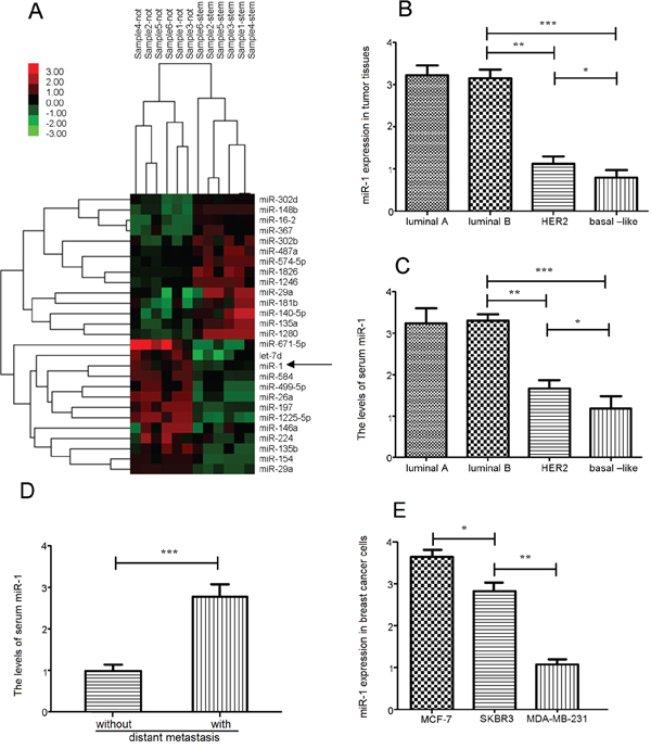 Figure 1: The expression of miRNAs in breast cancer. A. The miRNA expression profile in six paired of breast CSC and non-CSC samples was characterized by miRNA microarray. The relative levels of miR-1 expression in different types of breast cancer tissue B. and serum samples C. were determined by quantitative RT-PCR. D. The relative levels of serum miRNA in patients (n = 18) with or without lymph node metastasis (n = 27). E. The levels of miR-1 expression in different types of breast cancer cell lines. Data are representative profile of clustered miRNA in individual samples and expressed as the mean ± SD of each group of samples from at least three separate experiments. N = 20 for luminal A; 10 for luminal B; 5 for Her2+; 10 for basal-like. *p < 0.05; **p < 0.01; ***p < 0.001.