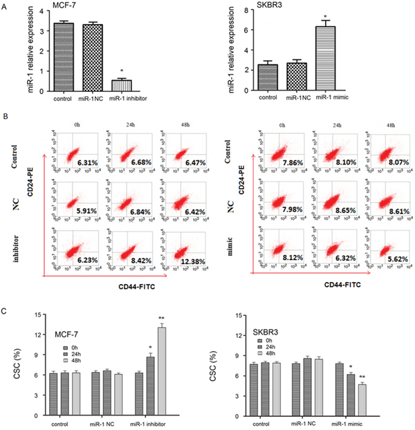 Figure 2: Altered miR-1 expression changes the percentages of breast CSC in breast cancer cell lines. MCF-7 and SKBR3 cells were transfected with, or without, miR-1 NC, miR-1 inhibitor, or miR-1 mimic for 24 or 48 h. The relative levels of miR-1 expression in different groups of cells were determined by quantitative RT-PCR A. The frequency of CD44+CD24− CSCs was determined by flow cytometry B–C. Data are representative FACS charts and expressed as the mean ± SD of each group of cells from three separate experiments. *p < 0.05, **p < 0.01 vs. the control CSCs.