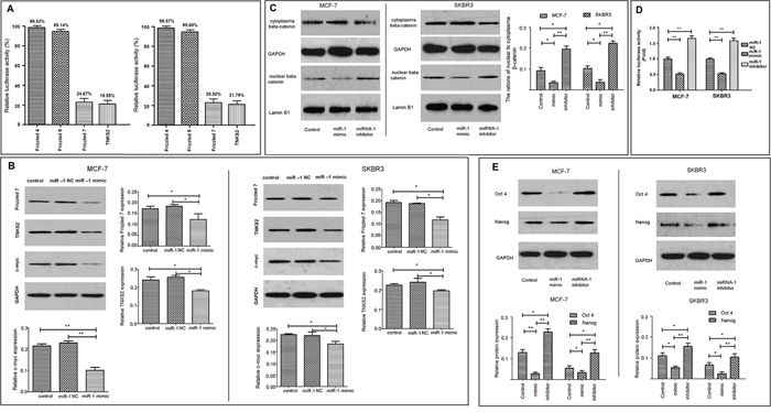 Figure 3: miR-1 inhibits the stemness of breast CSCs by targeting the Wnt/β-catenin signaling. 293T cells were transfected with luciferase reporter plasmids containing the 3UTR sequences of the fizzled 4, 5, 7, or TNKS2 and miR-1 or control miR-1NC and the effect of miR-1 on luciferase activity was determined A. The luciferase activity in the control cells that had been transfected with miR-1NC were considered as 100%. CD44+CD24− CSC from MCF-7 and SKBR3 cells were sorted and transfected with, or without, miR-1NC, miR-1inhibitor, or miR-1mimic for 24 or 48 h. The relative levels of fizzled 7, TNKS2 and c-Myc to control GAPDH were determined by Western blot B. In addition, the relative levels of cytoplasmic and nuclear β-catenin to GAPDH or lumen B1 in each group of cells were determined by Western blot C. Moreover, MCF-7/CSC and SKBR3/CSC were transfected with miR-1mimic, miR-1NC or miR-1inhibitor for 24 h. The cells in each group were transfected with TopFlash and pRL-TK for 48 h. The relative levels of β-catenin-dependent firefly luciferase activity in different groups of CSCs were determined by the dual luciferase assay D. The relative levels of β-catenin-dependent luciferase activity in the control cells that had been transfected with miR-1NC, TopFlash and pRL-TK were designated as 1. Finally, the relative levels of Oct4 and Nanog expression in each group of cells were determined by Western blot E. Data are representative images and expressed as the mean ± SD of each group of cells from three separate experiments. *p < 0.05; **p < 0.01.