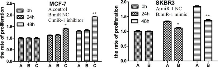 Figure 4: miR-1 inhibits breast CSC proliferation in vitro. CD44+CD24− CSCs from MCF-7 and SKBR3 cells were transfected with, or without, miR-1 NC, miR-1 inhibitor, or miR-1 mimic for 24 or 48 h. Their proliferation was determined by MTT assay. Data are expressed as the mean rates ± SD of each group of cells from three separate experiments and proliferation of untransfected control CSCs was designated as 1. *p < 0.05; **p < 0.01 vs. the miR-1 NC and control CSCs.
