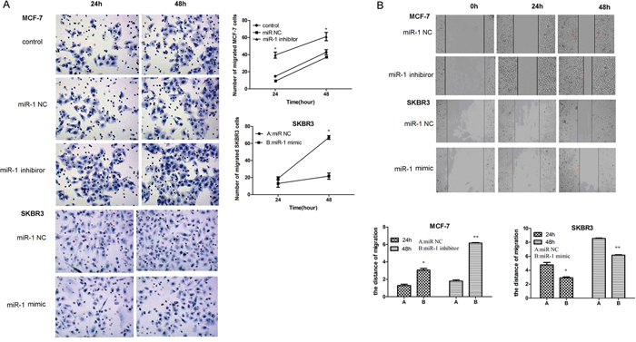 Figure 5: miR-1 inhibits the migration and wound healing of CSC in vitro. CD44+CD24− CSC from MCF-7 and SKBR3 cells were transfected with, or without, miR-1 NC, miR-1 inhibitor, or miR-1 mimic. Four hours after transfection, the migration of different groups of CSC for the indicated time points was determined by transwell migration assay A. In addition, two days after transfection, the wound healing of different groups of cells within 24 or 48 h was tested B. Data are representative images and expressed as the mean ± SD of each group of cells from three separate experiments. The number of migrated SKBR3/CSCs was similar to those of SKBR3/miR-1NC CSCs and the migration distance of control MCF-7CSC and SKBR3/CSC was similar to those of MCF-7/miR-1NC and SKBR3/miR-1NC CSCs, respectively (data not shown). *p < 0.05; **p < 0.01 vs. the miR-1 NC-transfected CSCs.