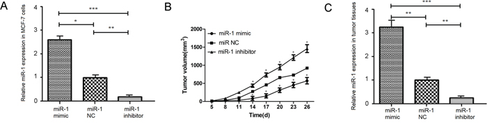 Figure 6: miR-1 inhibits the growth of implanted breast tumors in vivo. The relative levels of miR-1 expression in the MCF-7/miR-1mimic, MCF-7/miR-1inhibitor or control MCF-7/miR-1NC CSCs were determined by quantitative RT-PCR A. The development and growth of implanted CSC-related tumors were monitored at the indicated time points post inoculation B. At the end of this experiment (on day 26 post inoculation), the relative levels of miR-1 expression in the different groups of dissected tumors were determined C. Data are expressed as the mean ± SD of each group of mice (n = 8 per group). *p < 0.05; **p < 0.01; ***p < 0.001 vs. the tumors induced by the MCF-7/miR-1NC CSCs.