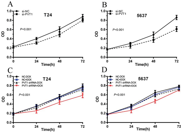 Figure 3: Cell proliferation was inhibited after transfection with special RNA or tetracycline-inducible shRNA vectors. CCK-8 was used to measure the cell growth. ANOVA was used to analyze the data. A, B. After transfection with si-PVT1, cell growth inhibition was observed in T24 (A) and 5637 (B) (P < 0.01). C, D. After transfection with PVT1 shRNA plus 1 ug/ml doxycycline, cell proliferation was suppressed in T24 (C) and 5637 (D). Error bars suggest mean ± SD (*P < 0.05, **P < 0.01).