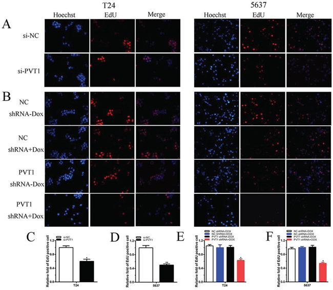 Figure 4: Cell growth was suppressed after transfection with special RNA or tetracycline-inducible shRNA vectors. A, B. Representative images of EdU assay in T24 and 5637. EdU positive cells were decreased after transfected with si-PVT1 in T24 and 5637. EdU positive cells were suppressed after transfected with PVT1 shRNA plus doxycycline in T24 (A) and 5637 (B). C, D, E, F. EdU incorporation rate was shown as ratio of EdU positive cells relative to Hoechst 33342 positive cells. Error bars suggest mean ± SD (*P < 0.05, **P < 0.01).