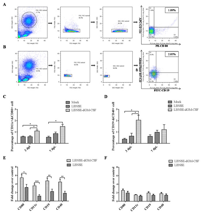 Figure 3: Measurement of DC and B cell activation in the peripheral blood after oral vaccination by flow cytometry and qRT-PCR. Dogs were sham-immunized or orally immunized with 1×108 FFU of LBNSE-dGM-CSF or LBNSE. Peripheral blood was collected on 3 and 7dpi. For flow cytometry, single cell suspensions were prepared and stained with antibodies for DCs (CD11c and CD80) or B cells (CD19 and CD40), and the representative gating strategy of DCs A. and B cells B. were displayed. The detailed analysis for activation of DCs C. and B cells D. were performed and presented. For qRT-PCR, PBMCs were isolated and total RNA was extracted, the mRNA level of surface co-stimulating markers of DCs (CD11c and CD80) and B cells (CD19 and CD40) at 3dpi E. and 7 dpi F. were detected using primers listed in S1 Table. Asterisks indicate significant differences analyzed by one-way ANOVA C. and D. or student T test E. and F. between the different groups. (*, P < 0.05; **, P < 0.01; ***, P < 0.001).