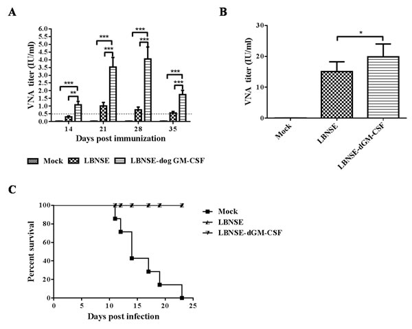 Figure 4: Detection of VNA titer after oral immunization and survivorship after challenge. Dogs were orally immunized with 1×108 FFU of LBNSE-dGM-CSF, LBNSE, or DMEM. Peripheral blood was collected at 2, 3, 4 and 5 weeks post immunization for VNA test by RFFIT A. At 5 weeks after immunization, immunized dogs were challenged with 4500 MICLD50 of wild-type RABV SXTYD01 by injecting it at masseter and temporal muscles. Peripheral blood was collected at 7 days post challenge and the serum was for VNA test B. After challenge, dogs were observed twice a day for 3 months and the numbers of survivors were recorded C. Asterisks indicate significant differences analyzed by one-way ANOVA between the different groups. (*, P < 0.05; **, P < 0.01; ***, P < 0.001).