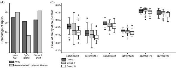 Figure 1: Location of CpG sites associated with paternal lifespan and methylation level of CXXC5. A. Location of CpG sites associated with paternal lifespan with regard to CpG islands. There were fewer than expected CpG sites found in CpG islands (hypergeometric test p < 0.05). B. Differences in the level of methylation in CXXC5. Level of methylation in each CpG site is presented for each group (Group I, progeny of shortest-lived fathers, Group III, progeny of longest-lived fathers).