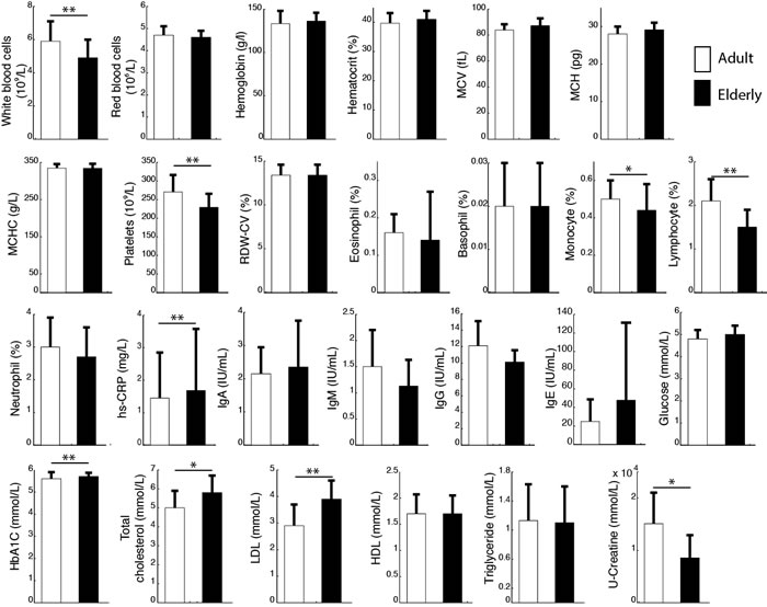 Clinical indices reflecting the general homeostasis of all participants in both groups are summarized in Figure 1. Levels of total cholesterol, low-density lipoproteins (LDL), high sensitivity C-reactive protein (hs-CRP) and glycated hemoglobin (HbA1C) were significantly higher in elderly compared with adults (p = 0.03; p = 0.001; p < 0.001; p = 0.002, respectively). To the contrary, platelets, white blood cell count and urinary creatine (U-Creatine) were higher in adults (p = 0.002; p = 0.007; p = 0.026, respectively).
