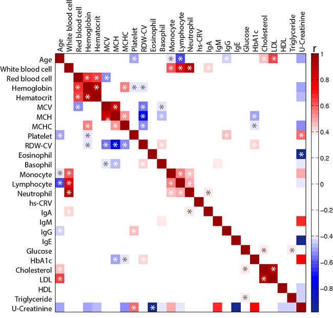 Figure 2: Heat map of the Spearman correlation (r) between blood biomarkers. Correlations were performed between each blood biomarker for the overall population. Key: MCV, mean corpuscular volume; MCH, mean corpuscular hemoglobin; MCHC, mean corpuscular hemoglobin concentration; RDW-CV, red cell distribution width; Hs-CRV, high sensitivity C-reactive protein; HbA1C, glycated hemoglobin; LDL, low density lipoprotein; HDL, high density lipoprotein. *Significant correlation (p < 0.05) after correction using Benjamini and Hochberg false discovery rate method with a false discovery rate Q = 0.20.