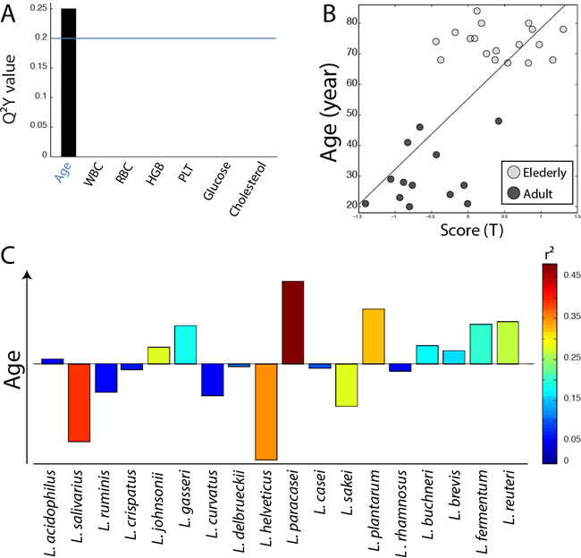 Figure 3: Association of Lactobacillus species profile with physiological parameters. A. Histogram of descending Q2Y values derived from O-PLS models performed using the profile of Lactobacillus species as X matrix and the quantitative levels of 7 physiological parameters as independent response predictors for the overall population (N = 32). B. Scores derived from the O-PLS model using age as a response predictor (R2Y = 0.51, R2X = 0.16, Q2 = 0.25, p-value = 0.003 and p-value FDR = 0.006). C. Loadings plot derived from the same model as in B.; Lactobacillus species pointing upward on the loadings plot are positively correlated with the elderly group, and Lactobacillus species pointing downward are correlated with the adult population.