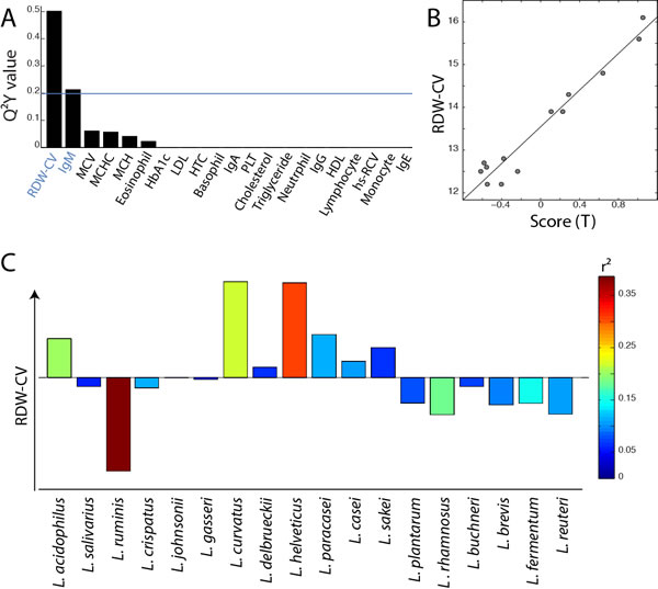 Figure 4: Association of Lactobacillus species profile with blood biomarkers in adult individuals. A. Histogram of descending Q2 values calculated from O-PLS model performed using the profile of Lactobacillus species as X matrix and the quantitative levels of 21 blood biomarkers as independent response predictors for the adult population only. B. Scores derived from the O-PLS model using RDW levels as a response predictor (this model uses one orthogonal component; R2Y = 0.95, R2X = 0.28, Q2Y = 0.67, p-value = 0.005 and p-value FDR = 0.013). C. Loadings plot derived from the same model as in B., Lactobacillus species pointing upward on the loadings plot are positively correlated with RDW levels.