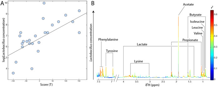 Figure 5: High total count of Lactobacillus sp. is associated with higher faecal SCFAs, lactic acid and amino acid levels. A. O-PLS scores projection of all individuals according to the decimal logarithm of total Lactobacillus counts. This model is derived from 1H-NMR spectra of faecal waters using the log of total Lactobacillus counts as a response predictor. B. Metabolic contribution of SCFAs, organic acids and amino acids to the same model (loadings plot). Metabolites pointing upwards are positively correlated with high Lactobacillus levels.