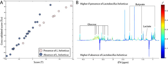 Figure 6: Presence of L. helveticus was associated with an increase in butyrate and lactate faecal counts. A. Scores plot derived from the O-PLS model using the absence (dark blue) or presence (light pink) of L. helveticus as a response predictor. The calculated scores (x axis) are plotted against the cross-validated scores (y axis). B. Loadings plot derived from the same model showing the metabolic contribution of butyrate, lactate and glucose. Metabolites pointing upwards correlate with the presence of L. helveticus.