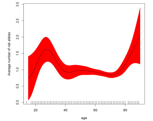 Figure 3: Average number of risk alleles as a function of age at diagnosis. Genetic risk alleles are more frequent in younger patients, with risk starting to increase again for older patients (>75 years). The X-axis depicts the number of risk alleles grouped in different categories (0, 1, 2, 3, +4 alleles). The right Y-axis represents the number of individuals (bars) while the left Y-axis shows the mean age (dots) for each risk score category.