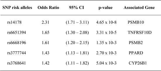 Among the genes listed in Table S1, eight are represented by three or more SNPs (Supplemental data Table S2). Three SNPs are associated with the histone deacetylase HDAC9, the caspase activation inhibitor AVEN, the semaphorin SEMA3C, the inhibitor of kappaB kinase beta (IKBKB), the glutathione S-transferase GSTA3, the receptor TNFRSF-interacting serine-threonine kinase 1 (RIPK1) and the growth factor FGF2. Four SNPs belong to the immunoproteasome subunits (PSMB2, PSMA8 and PSMB10) and six SNPs are located in the SLC15A1 gene, a solute carrier of di- and tripeptides.