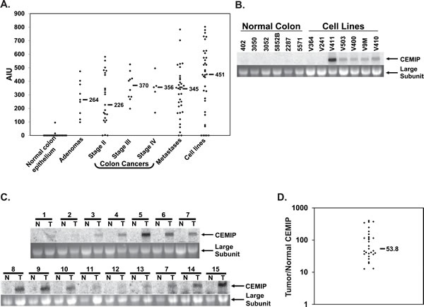 Figure 1: CEMIP mRNA expression in normal colon epithelium and colon cancer samples. A. Expression levels of CEMIP measured on GeneChip microarrays for samples of normal colon epithelium, colon adenomas, colon cancer primary tumors of stages II, III and IV, colon cancer hepatic metastases, and colon cancer cell lines. Horizontal bars denote median expression values within each group. Transcript hybridization to expression microarrays is measured in Average Intensity units (AIU). B. Northern blot analysis of CEMIP expression in 6 normal colon epithelium samples versus colon cancer cell lines (upper panel). C. Northern blot analysis of CEMIP expression in 15 samples of colon cancer tissue (T) and paired normal colonic mucosa (N), upper panels. The lower panels are the ethidium bromide stains of the 28S ribosomal RNA subunit for each of the corresponding samples. D. Real-time PCR measurement of CEMIP transcript expression. Shown is the ratio of CEMIP expression in colon cancer versus matched normal colon mucosa for 29 patients. CEMIP values are normalized against expression of the house-keeping gene Beta-2-microglobulin. Horizontal black bar denotes mean value.