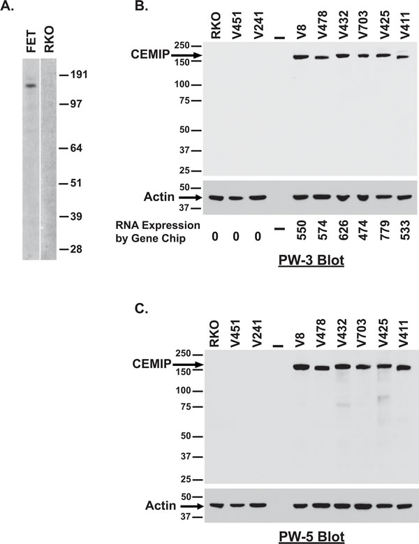 Figure 2: Detection of endogenous CEMIP protein in colon cancer cell lines. A. Western blot analysis of lysates from CEMIP transcript expressing FET colon cancer cells versus CEMIP non-expressing RKO colon cancer cells using anti-CEMIP monoclonal antibody PW-3. B.-C. Western blot analysis of lysates for CEMIP transcript expressing lines versus non-expressing lines using anti-CEMIP monoclonal antibody PW-3 B. or anti-CEMIP monoclonal antibody PW-5 C.. Blotting for actin was used to control for sample loading. Corresponding mRNA expression levels are indicated below panel 2B.