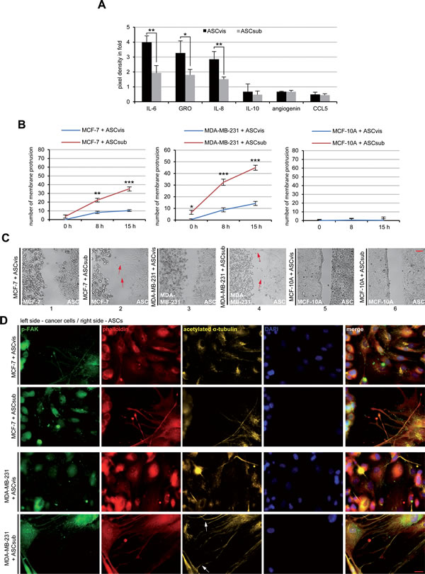 For attraction assay, cells were placed in a 6-cm culture dish and one well of each insert was filled with cell suspensions either with visceral or subcutaneous ASCs (5.5 x 104) or with the investigated cells (MCF-7, MDA-MB-231, fibroblasts or MCF-10A). After 8 h, the culture-inserts were removed and the images were obtained at indicated time points. Cellular movement toward other migration front was evaluated using the AxioVision SE64 Re. 4.9 software (Zeiss). The experiments were independently performed three times.