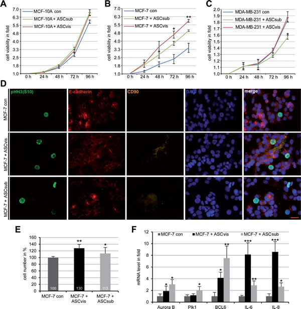 Furthermore, we show that, in a direct co-culture manner, visceral ASCs promote proliferation of the low malignant breast cancer line MCF-7, but hardly affect the cell viability of the invasive breast cancer cell line MDA-MB-231. Compared to visceral ASCs, subcutaneous ASCs are much less competent to stimulate proliferation of MCF-7 cells and even weakly inhibit expansion of MDA-MB-231 cells. Interestingly, both ASCs impact also slightly proliferation of normal mammary epithelial cells MCF-10A. The reduced effect of subcutaneous ASCs might be explained by a reduced expression of various cytokines like IL-6 and IL-8 known to be involved in breast cancer proliferation [42, 43]. The immovableness of MDA-MB-231 cells could be due to their receptor composition, the negative expression of ER, PR and HER2 [16], in line with the notion that triple negative breast cancer cells respond differently to Notch, Hedgehog, Wnt/β-catenin and TGFβ signaling pathways [44], which are activated by ASCs [45, 46]. Furthermore, direct cell-cell incubation induces an upregulation of mitotic genes Aurora B and Plk1, cytokine genes IL-6 and IL-8 and the oncogene BCL6 known for their tumor promoting functions [17, 42, 47]. Intriguingly, indirect incubation via a transwell system seems to be inefficient to promote proliferation, indicating that a direct cell-cell contact, possibly combined with the extracellular matrix associated growth factors, is required for an effective proliferation.