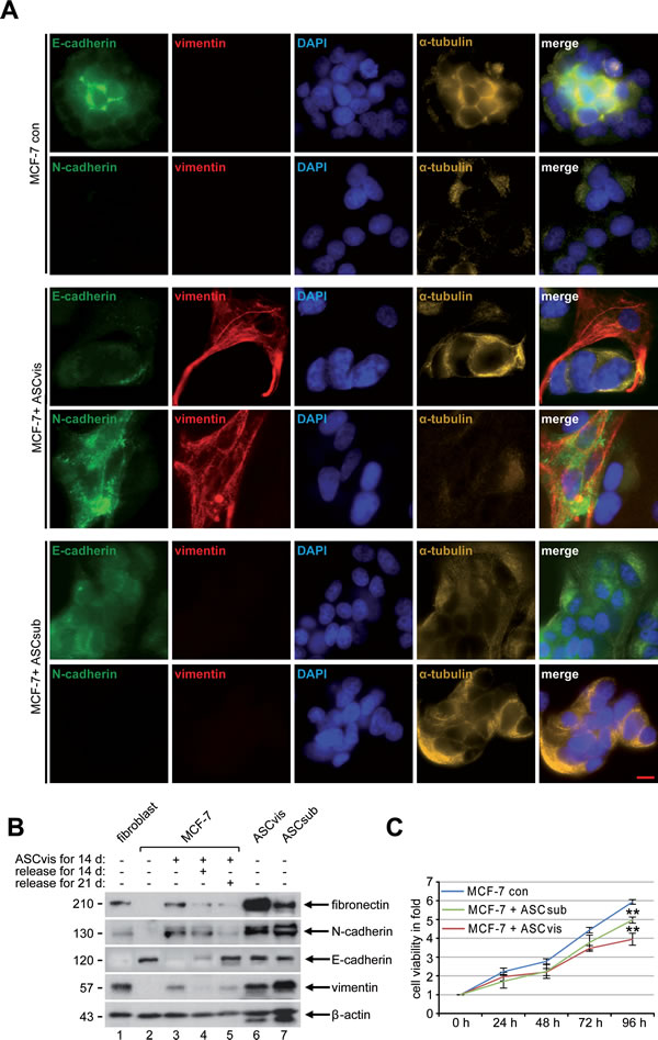 To further delineate the relationship between ASCs and cancer progression, we have isolated ASCs from visceral and subcutaneous adipose tissue collected from female donors undergoing caesarian section, characterized their features and studied their impact on breast cancer cells. To exclude variations between isolated ASCs from different donors, we performed most of the studies with paired visceral and subcutaneous ASCs of the same donor with a comprehensive number. Our study reveals distinct properties of these two types of ASCs with varied effects on cancer cells. Interestingly, visceral ASCs are more potent to induce the epithelial-to-mesenchymal transition in breast cancer cells mediated by activating multiple pathways in particular the PI3K/AKT signaling.