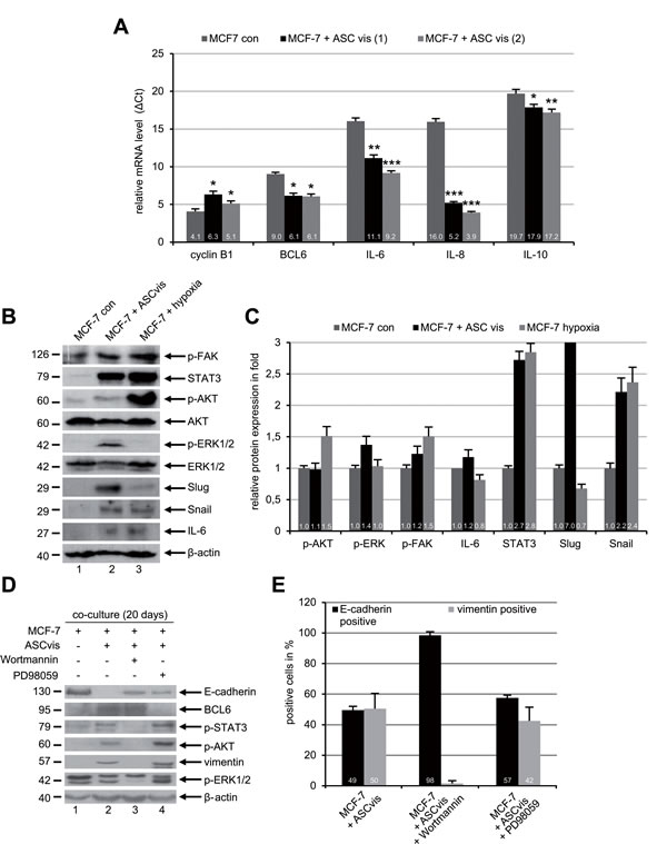 Moreover, our results reveal that, despite varied capability, both types of ASCs are able to induce EMT in breast cancer cells by indirect co-culturing. This process is illustrated by a changed morphology, altered cytoskeleton composition and a reduced proliferation rate. Along with the modification of the cytoskeleton, the mRNA levels of BCL6, IL-6, IL-8 and IL-10 are highly increased, which are all well documented to induce EMT by multiple pathways in diverse cell lines [47-50]. Of note, we show that BCL6, a crucial player involved in B cell-lymphoma [51], is increased in MCF-7 cells upon direct co-incubation with ASCs promoting proliferation, as described above, and upon indirect co-culture in a transwell system with ASCs facilitating EMT in MCF-7 cells. In line with previous observation [52], our data highlight that BCL6 is pivotal in progression of breast cancer cells stimulated by ASCs. Furthermore, Western blot analyses with lysates from mesenchymal-like MCF-7 cells display increased activation of the PI3K/AKT, ERK1/2 and p-FAK pathways, together with enhanced expression of the transcription factors Snail, Slug and STAT3, also known as key players in the EMT process [53]. The results from treatment with kinase inhibitors suggest that the PI3K/AKT pathway is required for the EMT induced by ASCs, whereas the MAPK pathway seems to be dispensable for this process unlike reported for human lens epithelial cells or ovarian cancer cells [54, 55]. Consequently, the EMT-like MCF-7 cells show a reinforced migration and invasion potential, and confer resistance to Plk1 inhibitors BI 2536 and BI 6727, in accordance with previous reports showing resistance to other chemotherapeutic drugs [56]. Along with EMT, MCF-7 cells express high levels of CD73 and CD90, two cell surface markers of mesenchymal stem cells, supporting the correlation between EMT and stemness [57]. Our results also suggest that low malignant breast cancer lines such as MCF-7 will be strongly impacted by ASCs, which enforce them into a more aggressive phenotype. In addition, subcutaneous ASCs, isolated from donors undergoing cesarean section, appear to be less competent in this study regarding their ability to promote proliferation and induce EMT in breast cancer cells. It has been reported that the reproductive state of donors hardly impacted the features of ASCs [58], it is still conceivable that various alterations in the pregnancy, like hormones, growth factors and metabolism, could affect ASCs and subsequently change their abilities. Further investigations are required to address this issue.