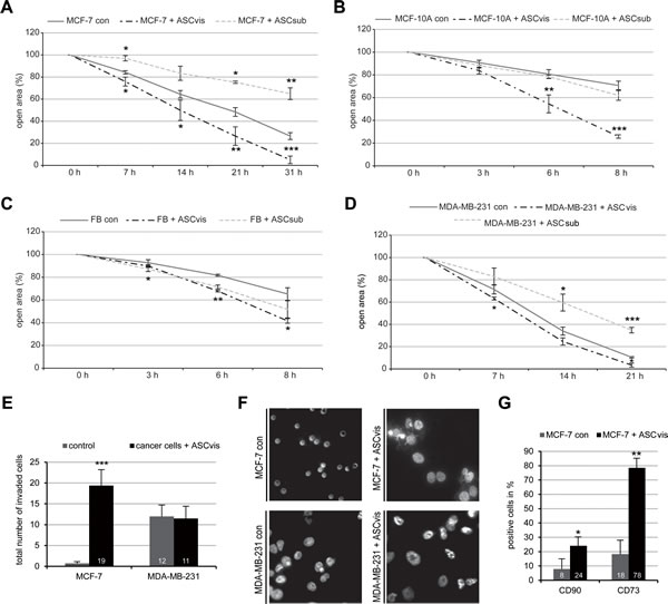 For invasion assay, MCF-7 and MDA-MB-231 cells were indirectly co-cultured with visceral ASCs in a transwell chamber for at least 14 days. Cells were then seeded in 24-well transwell matrigel chambers according to the manufacturer’s instructions (Cell Biolabs Inc, San Diego) and as previously reported [26]. Briefly, cells (MDA-MB-231, 7.5 x 104; MCF-7, 12 x 104) were seeded into the upper chamber of the transwell in 500 µl serum-free medium and the lower chamber was filled with 750 µl serum-free medium. After 12 h the medium of both chambers was discarded and the invasion assay was started by adding medium containing 10% fetal bovine serum for the next 24 h. Cells were fixed with ethanol and stained with DAPI. Invaded cells were counted with a microscope. The experiments were independently performed three times.