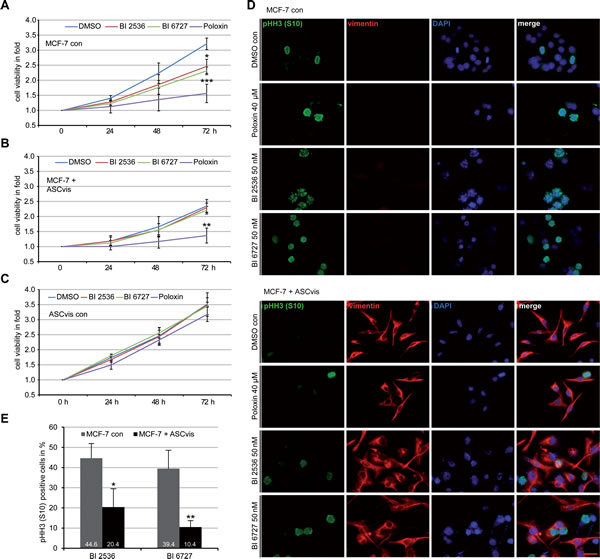 To evaluate the mitotic fraction, MCF-7 cells and MCF-7 cells indirectly co-cultivated with visceral ASCs for 14 days, were seeded into slide flask chambers. After 8 h the cells were treated with 50 nM BI 2536 or 50 nM BI 6727 for 48 h. Cells were stained for phospho-histone H3 (pHH3, S10). Five pictures of each slide flask were taken and the experiments were performed in triplicate. The percentage of positive pHH3 (S10) cells were evaluated using the AxioVision SE64 Re. 4.9 software (Zeiss).