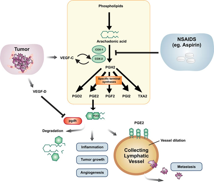 The interaction between the PG and VEGF-C/VEGF-D pathways has led investigators to define the impact of NSAIDs, the prototypic inhibitors of COX-2, on metastatic disease. It has been shown that regular intake of NSAIDs reduces the incidence of cancers but the significance on metastasis is only beginning to emerge [24, 111].