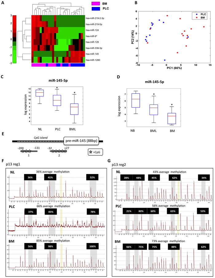 Figure 1: miR-145-5p expression is down-regulated in brain metastases. A. Heat map of the identified signature of 8 miRs differentially expressed in 13 brain metastasis (BM) versus 13 matched primary lung cancer (PLC). B. Unsupervised principal component analysis (PCA). C. qRT-PCR analysis of miR-145-5p expression levels in 10 normal lung (NL), 13 matched primary lung cancer (PLC), and 29 brain metastases from lung (13 matched and 16 unmatched) (BML). D. qRT-PCR analysis of miR-145-5p expression levels in 6 normal brain (NB), 29 brain metastases from lung (BML) and 15 brain metastases from melanoma (6) and breast (9) (BM). E. Schematic representation of miR-145-5p CpG island genomic localization. F.-G. Pyrosequencing analysis of miR-145-5p CpG island methylation status in a representative patient of the casuistry (NL= normal lung; PLC= primitive lung cancer; BM= brain metastases; p= patient; reg1= region 1; reg2= region 2).