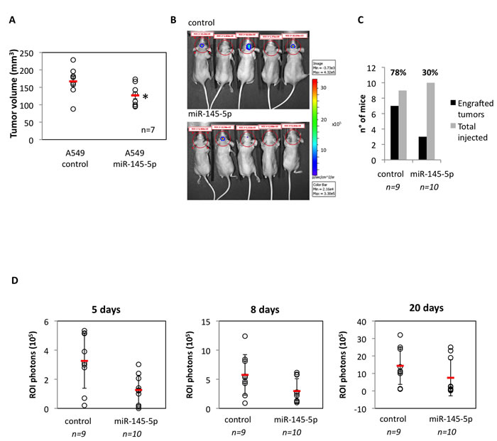 To test in vivo the antitumoral effects of miR-145-5p, we subcutaneously injected nu/nu athymic mice with either human lung cancer cells, either control A549 cells, or A549 cells expressing an exogenous miR-145-5p (A549/miR-145-5p). We firstly observed in vitro that ectopic expression of miR-145-5p markedly reduced migration of A549 cells but had no effect on cell proliferation and viability (Supplementary Figure S6A-C). We found that the engraftment of A549/miR-145-5p cells was significantly less efficient than that of A549 control lung cancer cells (Figure 2A). To investigate the role of miR-145-5p on brain metastasis we performed intracranial orthotopically injection of A549-luc/miR-145-5p and A549-luc/control cells in nu/nu athymic mice. Bioluminescence images collected at day 8 and at day 20 revealed that A549-luc/miR-145-5p engrafted in 3/10 mice (30%) while A549-luc/control cells in 7/9 (64%) mice (Figure 2B-2D). Specifically, on day 5, three miR-145 mice displayed ROI >=2. On days 8 and 20, these three animals had median (range) ROI of 5.85 (5.75-6.15) and 23 (19-25) (Figure 2D). In contrast, on day 5, seven miR-145 mice had ROI<2. By day 8 or day 20, these seven animals had median (range) ROI of 1.32 (1-2.8) and 0.8 (0.2-2.6), respectively (Figure 2D). The median differences were statistically significant (p = 0.022 at day 8 and p = 0.017 at day 20). In parallel, amongst control mice, on day 5 seven animals had ROI >=2, and on day 8 and 20 these animals displayed median (range) ROI of 5.53 (4.3-12.4) and 13.8 (10-32) (Figure 2D), respectively. On day 5, the two control mice displayed ROI<2 and their median (range) on day 8 and day 20 were ROI of 1.55 (0.9-2.2) and 1.15 (1-1.3), respectively (Figure 2D). The median differences were statistically significant (p = 0.056 at day 8 and day 20). Altogether these findings strongly support an in vivo evidence of the role of miR-145-5p in brain metastasis.