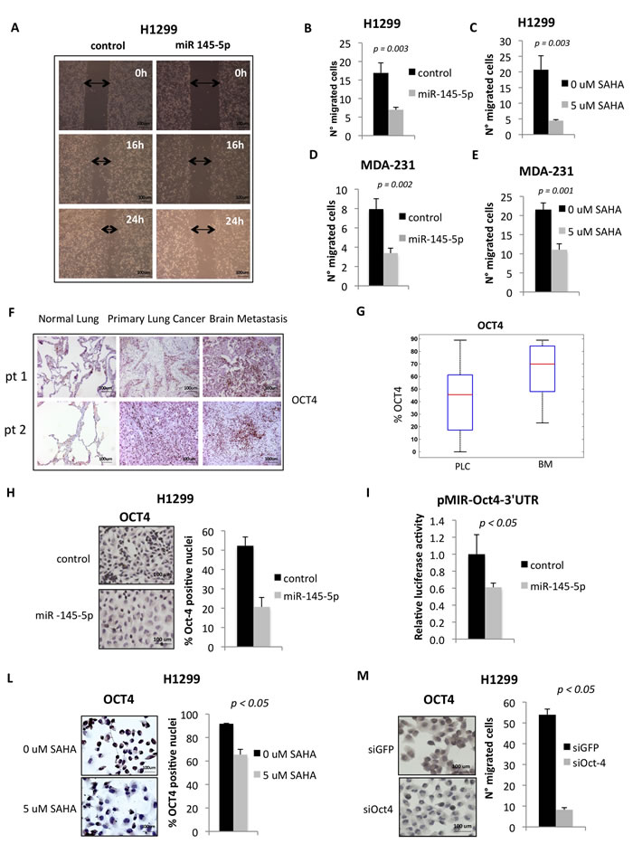 Figure 3: miR-145-5p expression impairs cell migration of H1299 and MDA-231 cells and inhibits Oct-4 protein. A. Wound healing assay in H1299 cells upon miR-145-5p over-expression. B.-E. Transwell migration assay in H1299 and MDA-231 cells upon miR-145-5p over-expression B. and D. or 24 hours of 5 uM vorinostat (SAHA) treatment C. and E. F. Immunohistochemistry for Oct-4 in 2 representative patients slides (pt=patient). G. Percentage of positive Oct-4 staining in tissues (PLC= primary lung cancer; BM= brain metastases). H. Oct-4 immunocitochemistry in H1299 cells upon miR-145-5p over-expression. I. Renilla luciferase activity of Oct-4-3’UTR reporter gene in H1299 transiently transfected with miR-145-5p mimic or control mimic. L. Oct-4 immunocitochemistry in H1299 cells upon 24 hours of 5 uM vorinostat (SAHA) treatment. M. Transwell migration assay in H1299 cells upon Oct-4 RNA interference.