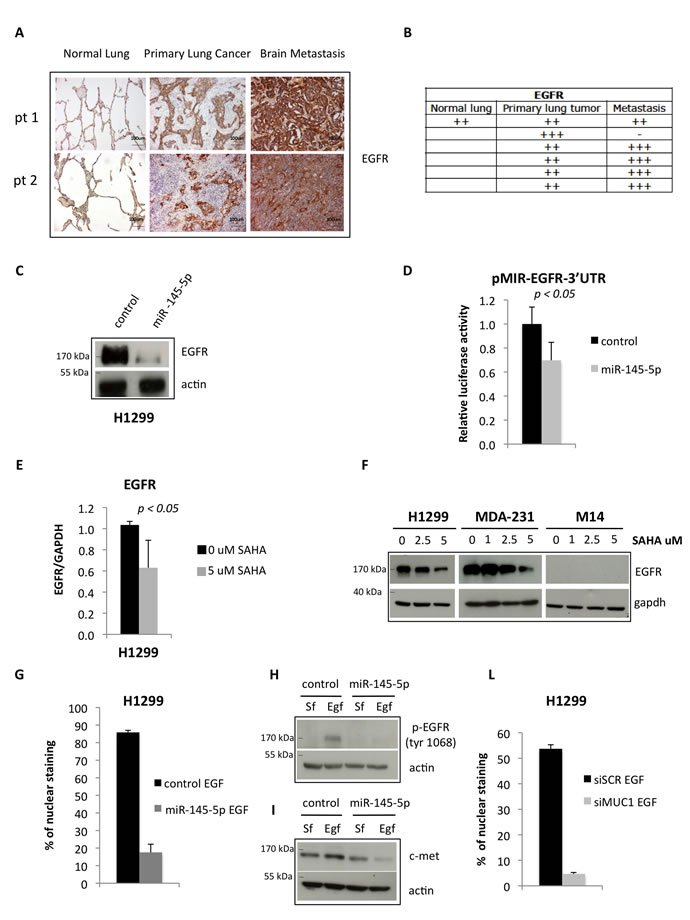 Figure 4: miR-145-5p impairs the expression of EGFR protein. A. Immunohistochemistry for EGFR in 2 representative patients slides (pt=patient). B. Quantification of positive EGFR staining in tissues. C. Western-blot analysis of EGFR protein expression in H1299 cells upon miR-145-5p over-expression. D. Renilla luciferase activity of EGFR-3’UTR reporter gene in H1299 transiently transfected with miR-145-5p mimic or control mimic. E. qRT-PCR analysis of EGFR mRNA levels in H1299 cells upon 5 uM vorinostat (SAHA) treatment. F. Western-blot analysis of EGFR in H1299, MDA-231 and M14 cells upon 24 hours of vorinostat (SAHA) treatments. G. Quantification of immunofluorescence assay to analyze EGFR localization in H1299 cells treated with EGF (20 ng/mL) upon miR-145-5p over-expression. H. Analysis of pEGFR protein expression levels in H1299 cells treated with EGF (20 ng/mL) or maintained in serum free (Sf) medium upon miR-145-5p over-expression. I. c-Met protein levels in H1299 cells treated with EGF (20 ng/mL) or maintained in serum free (Sf) medium upon miR-145-5p over-expression. L. Quantification of immunofluorescence assay to analyze EGFR localization in H1299 cells treated with EGF (20 ng/mL) upon MUC-1 RNA interference.