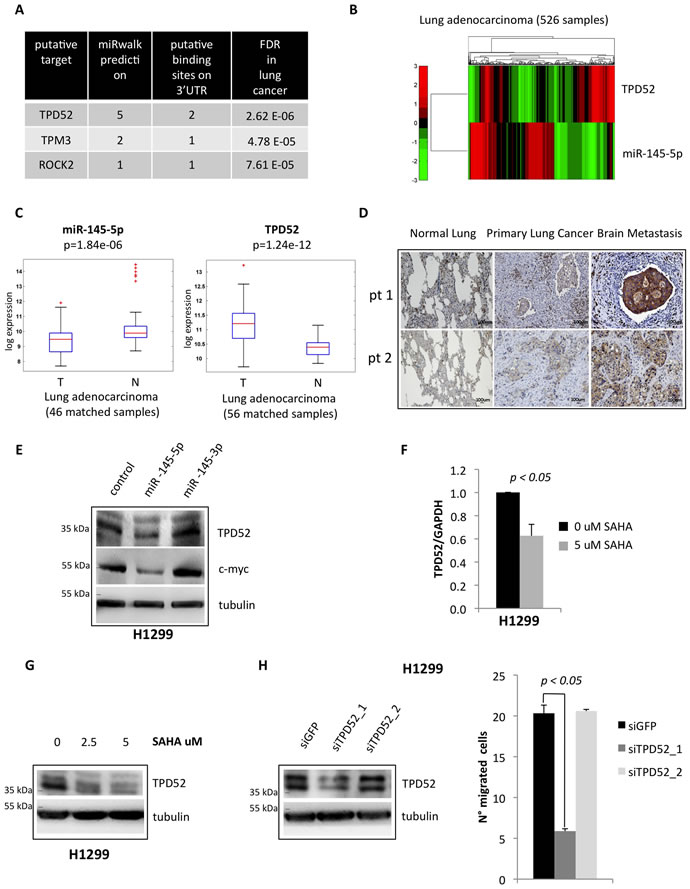 To further dissect the contribution of miR-145-5p down-regulation to metastasis we searched for additional, yet undiscovered, mRNA targets, the annotated functions of which could be related to dissemination of tumor cells. Putative mRNA targets of miR-145-5p were identified using miRWalk [35]. Next, permutation tests and false discovery procedures were used to further select out of the shortlisted miRs several mRNA targets that are deregulated when normal and tumoral samples are compared in The Cancer Genome Atlas (TCGA) lung adenocarcinoma data set (Figure 6A) [36]. Among these mRNAs, we noted TPD52, whose product promotes metastasis. Thus, TPD52 emerged as a potential and biologically relevant target of miR-145-5p in the process of metastatic colonization of brain [37, 38]. As shown in Figure 6B and Supplementary Figure S11A, TPD52 gene expression was found to be inversely correlated to miR-145-5p expression in both lung and breast cancer data sets from the TCGA consortium [36, 39]. Moreover in the lung data set we observed strong down-regulation of miR-145-5p and up-regulation of TPD52 mRNA when comparing tumoral and matched normal samples (Figure 6C). Indeed, the 3’-UTR of TPD52 contains two consensus binding sites miR-145-5p (Supplementary Figure S11B). Interestingly, TPD52 protein expression was increased in matched brain metastasis, when compared to both normal lung and primary lung cancer tissues (Figure 6D). In line with these observations, ectopic expression of miR-145-5p reduced the TPD52 protein levels (Figure 6E). This effect was not evidenced upon expression of miR-145-3p that is produced by the complementary strand of the miR-145 locus (Figure 6E). Interestingly, treatment of H1299 cells with vorinostat, which restored the expression of miR-145-5p, led to a reduction of TPD52 transcript and protein levels (Figure 6F-6G). At the functional level, siRNA-mediated knock down of TPD52 (siTPD52_1) markedly impaired migration of H1299 cells (Figure 6H), but siTPD52_2 or siGFP oligonucleotides, which failed to affect TPD52 expression, did not have any effect on migration of H1299 cells (Figure 6H).