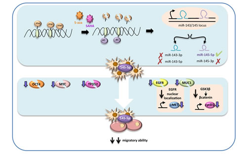 Figure 7: Schematic representation of the proposed molecular mechanism. In highly metastatic lung cancer cells miR-145-5p expression is maintained at low levels by epigenetic modifications, such as hypermetylation and deacetylation of its promoter. Treatments with epigenetic drugs, such as vorinostat (SAHA) and 5-azacytidine (5-aza), could restore miR-145-5p expression, that in turns has a strong inhibitory effect on OCT-4, EGFR, MUC-1, MYC and TPD52 proteins expression. In particular MUC1 protein down-regulation potentiates the inhibitory effect on EGFR activity as it prevents EGFR nuclear localization. The final effect of miR-145-5p multi-targeting activity restoration results in a significant inhibition of the migratory ability of lung cancer.