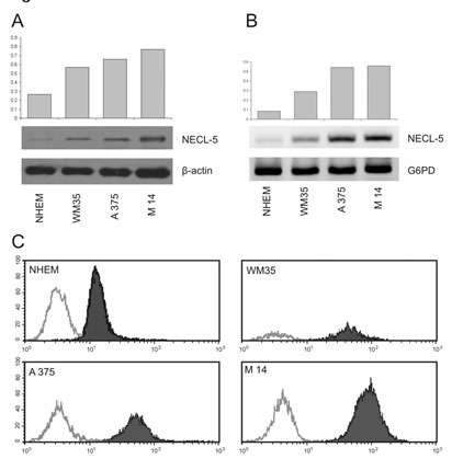 Figure 1: Expression analyses of NECL-5 in WM35, M14 and A375 cell lines. 1A) Western blot in WM35, M14 and A375 cell lines, compared with NHEM. The upper bands represent NECL-5 protein, and the lower bands are β-Actin used as an internal control. The intensities of these bands were quantified by the Kodak 1D image analysis software. 1B) mRNA expression of NECL-5 gene by RT-PCR using G6PD for normalization. 1C) Flow cytometry analysis of NECL-5 expression. Histograms compare staining with specific antibody (black line) with the appropriate isotype control antibody (gray line).