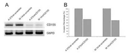 A double stranded siRNA oligonucleotide targeting CD155 (5’-CAACUUUAAUCUGCAACGUdTdT-3’) was chemically synthesized (Dharmacon Research) and transfected into WM35, A375 and M14 cells using Oligofectamine (Invitrogen) following manufacturers instructions using 200 nM siRNA per 10 cm dish. Cells were incubated with siRNA in OptiMEM (Invitrogen) for 6 hrs after which time normal growth media was added. Cells were then incubated for 72 h to achieve >80% knockdown of CD155. Control cells were transfected with a scrambled siRNA oligonucleotide at matching concentration. After transfection, cells were harvested and subjected to the invasion assay.