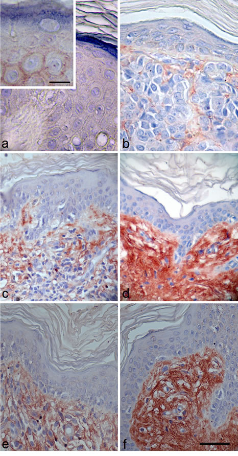 IHC evaluation of NECL-5 was also performed in 20 benign nevi and 71 melanoma specimens, including 12 metastatic melanoma (Figure 3). Normal skin tissues showed no immunostaining (Figure 3a) whereas a positive immunostaining was in CMMs specimens (Figure 3c and 3d). The immunopositivity for NECL-5 was also significantly different between the benign (nevi) (Figure 3b) and malignant lesions (primary and metastatic melanomas) (Figure 3c and 3d). Ten of 20 (50%) benign nevi samples had minimal weak immunostaining of NECL-5. It was mainly detected in the outer zones of the rows of melanocytes and, almost absent, in cell-cell contacts between melanocytes (Figure 3b). In 3 nevi, NECL-5 immunostaining was present in the epidermis and upper dermis. Almost 91.5% of all melanoma specimens (primary and metastatic melanomas) showed an enhanced NECL-5 immunoreactivity (Figure 3c and 3d) when compared with the benign nevi tissue samples (Figure 3b) (P<0.0001). In primary melanoma, NECL-5 staining was detected in cytoplasm and/or membrane of cancer cells. Immunoreactivity of NECL-5 was observed to be higher, within tumor cells, in metastatic melanomas than in primary melanoma (P<0.001). A strongly labelled for NECL-5 there were in the papillary dermis, and variably in the reticular dermis and around blood vessels (Figure 3d). As shown in Figure 3e and 3f, NECL-5 expression is higher in melanoma sections with thickness > 1 mm in comparison with those with thickness ≤ 1 mm.